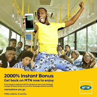 Well, If you have not used your MTN network for the past 45 days, kindly look for it and insert the SIM into your device and get 2000% instant bonus on your first recharge in a month for the next 3 months.